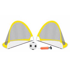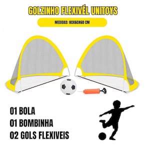 -formato portátil, colorido e de montagem simples -os golzinhos são flexíveis e com rede durável -o kit traz bola, bomba e bolsa para transporte -um conjunto com gol de 60cm, 80cm de largura e acessórios práticos.