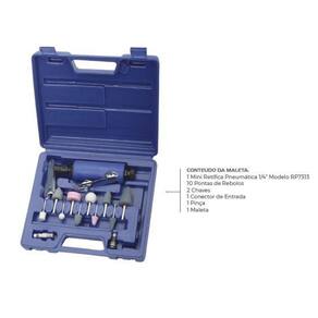 O Kit Retífica pneumática RP7813 de 1/4' foi desenvolvido para e industrial em linhas de montagem, marcenarias, serralherias, nos acabamentos de superfícies soldadas, alargamento de furos, acabamento em moldes, matrizes e muito mais Possui design compacto, com cabo ergonômico que permite realizar trabalhos com menor vibração e maior precisão na hora de fazer acabamentos. IMPORTANTE: Recomendamos a utilização do filtro regulador lubrificador e manter a pressão em 90 psi com a máquina em funcionamento. ITENS DO KIT: 1 Mini retífica pneumática 1/4' 2 chaves 10 rebolos 1 engate rápido 1 pinça CARACTERÍSTICAS TÉCNICAS Pinça: 1/4' Rotação sem carga: 25000 rpm Consumo de ar: 3 pcm 85 l/min Vibração no punho: 0,8 m/s2 Ruído por pressão: 84,1 dB A Entrada de ar: 1/4' Pressão de operação: 90 psi Mangueira de alimentação: 3/8' Ruído por potência: 95,1 dB A Peso líquido: 0,3 kg Dimensões da embalagem: 325 x 199 x 60 mm Peso bruto: 1,3 kg Marca: Não Informado