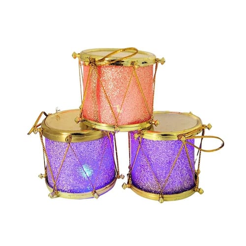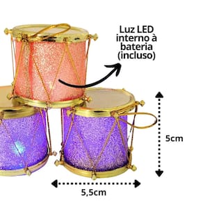 Adicione um toque especial e luminoso à sua decoração natalina com este kit de 3 mini tambores decorativos. Cada tambor tem acabamento em glitter dourado e é iluminado por LEDs que piscam em cores vibrantes de roxo e vermelho, criando um efeito festivo e encantador. Com dimensões de 6cm x 5cm, eles são perfeitos para enfeitar a árvore de Natal ou outros arranjos decorativos.