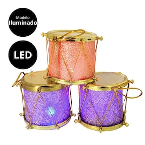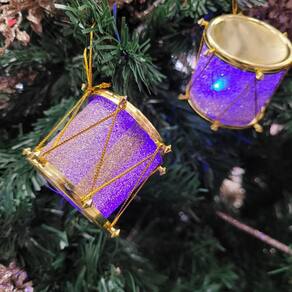 Adicione um toque especial e luminoso à sua decoração natalina com este kit de 6 mini tambores decorativos. Cada tambor tem acabamento em glitter dourado e é iluminado por LEDs que piscam em cores vibrantes de roxo e vermelho, criando um efeito festivo e encantador. Com dimensões de 6cm x 5cm, eles são perfeitos para enfeitar a árvore de Natal ou outros arranjos decorativos.