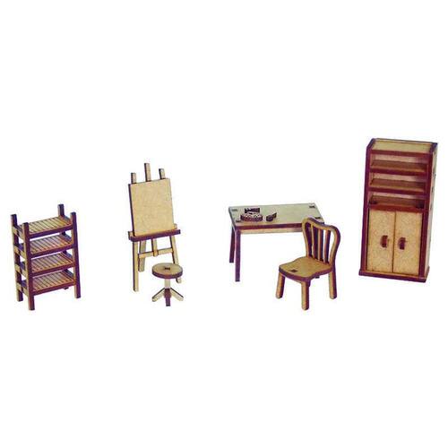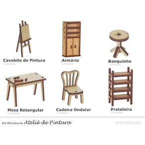 O kit contém: 1 cavalete de pintura: 8,7cm de altura x 3,5cm de largura x 3,3cm de comprimento 1 armário: 8,5cm de altura x 4,3cm de largura 1 banquinho: 2cm de altura x 2cm de largura x 2cm de comprimento 1 mesa retângular : 4cm de altura x 3,5cm de largura x 6cm de comprimento 1 cadeira angular : 4,7cm de altura x 3cm de largura x 3cm de comprimento 1 prateleira: 5,5cm de altura x 3,5cm de largura