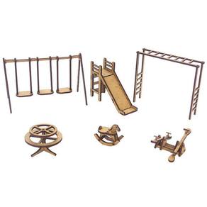 São móveis extremamente caprichados, onde as portas abrem e fecham e tampas sobem e descem. Recomenda O kit comos que se as peças forem pintadas, que aplique uma demão de goma laca antes, pois por causa do corte a laser, a tinta pode amarelar. O móveis já vem montados. Contém: 1 escorregador: altura: 8 cm; comprimento: 11 cm; largura: 3,1 cm 1 escada horizontal: altura: 11 cm; comprimento: 12,8 cm; largura: 3 cm 1 gangorra: altura: 2,6 cm; comprimento: 7,8 cm; largura: 4,6 cm 1 gira gira: altura: 4 cm; comprimento: 6 cm; largura: 6 cm 1 cavalo de balanço: altura: 3,8 cm; comprimento: 4,8 cm; largura: 2 cm 1 balanço: altura: 10 cm; comprimento: 15 cm; largura: 7 cm