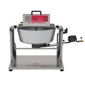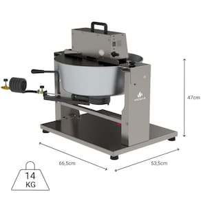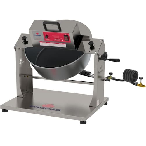 Ideal para cremes que precisam ser mexidos constantemente, como brigadeiros, recheios de bolo, geléias, entre outros. Ela facilita a rotina de profissionais da confeitaria, com sua praticidade e eficiência. O aquecimento da panela é realizado com o auxilio de um fogão e a rotação do misturador com energia elétrica. Possui controle eletrônico de velocidade, temporizador digital, cabeçote em chapa de aço inox, caçarola em alumínio fundido. O produto é para uso no fogão a gás, apenas o misturador é elétrico. Fácil manuseio e limpeza e que agilizará muito o processo de fabricação.