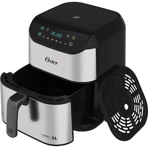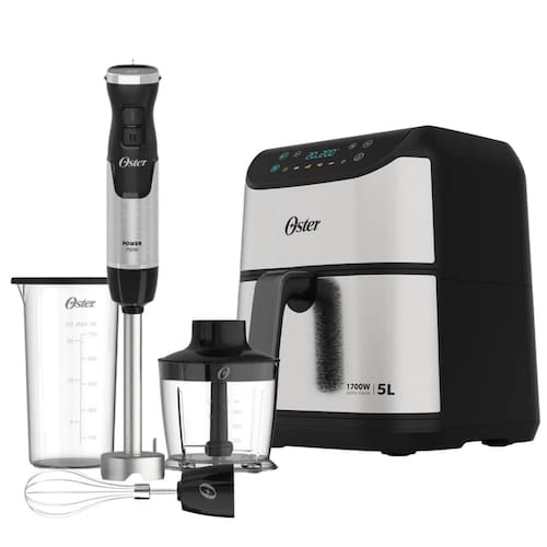 Kit composto por Fritadeira Digital Inox Oster 5L e Mixer Power Oster Black Inox 3 em 1. Fritadeira com painel digital touch, grelha Easy Clean. Mixer com motor de 750W, função Turbo, acompanha fouet, miniprocessador de 500ml e copo de 750ml.Porta-fio