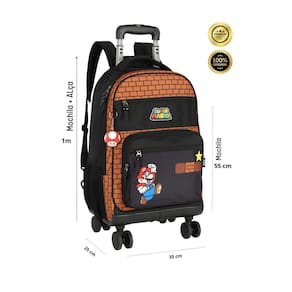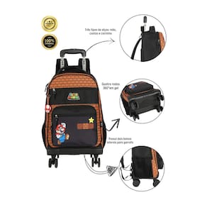 Kit escolar mochila 4 rodas 360º+estojo box super mario mochila com rodas: Confeccionada em poliéster Fechamento em zíper Puxadores personalizados Compartimentos espaçosos 2 bolsos laterais para garrafa Possui rodas e alças de costas reguláveis e alça de mão Design exclusivo Medidas altura: 50 cm largura: 20 cm comprimento: 30 cm Estojo box: