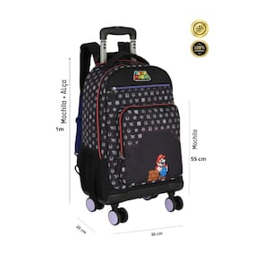 Kit escolar mochila 4 rodas 360º+estojo box super mario mochila com rodas: Confeccionada em poliéster Fechamento em zíper Puxadores personalizados Compartimentos espaçosos 2 bolsos laterais para garrafa Possui rodas e alças de costas reguláveis e alça de mão Design exclusivo Medidas altura: 50 cm largura: 20 cm comprimento: 30 cm Estojo box: