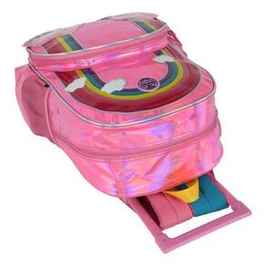 Esse lindo kit escolar arco íris metalizado vai fazer sucesso entre a garotada. Esse modelo conta com 1 compartimento principal e dois bolsos laterais para colocar a garrafa. Possui 2 rodinhas de silicone e 2 apoiadores frontais para mantê-la em pé.