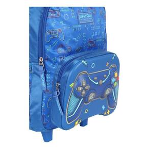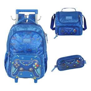 Esse lindo kit escolar controle de vídeo game vai fazer sucesso entre a garotada. Esse modelo conta com 3 compartimentos e dois bolsos laterais para colocar a garrafa. Possui 2 rodinhas de silicone e 2 apoiadores frontais para mantê-la em pé.