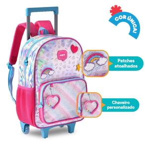 Kit Mochila de Carrinho HL24563 + Lancheira Térmica HL24565 + Estojo HL24566 Transforme o dia a dia escolar em uma experiência cheia de estilo com este incrível kit holográfico A Mochila de Carrinho HL24563 é perfeita para carregar todos os materiais escolares com praticidade e conforto, seja no carrinho com suas rodinhas ou nas costas com suas alças ajustáveis. Ela tem um compartimento principal espaçoso e bolsos laterais telados, e um bolso na frente também com fechamento por zíper, garantindo muito espaço para melhor organização. O toque especial está no material holográfico multicolorido, recortes em glitter e patches atoalhados que encantam à primeira vista. A Lancheira Térmica HL24565 complementa o kit com um compartimento espaçoso e revestimento térmico que mantém os lanches frescos. Com alça de ombro e alça carona, é prática e combina perfeitamente com a mochila. Já o Estojo HL24566 é a cereja do bolo: dois compartimentos organizam os itens escolares com a mesma modernidade e fofura do conjunto. Adquirir o kit completo é muito mais vantajoso: além da economia, todos os itens combinam entre si, garantindo um visual harmônico e cheio de personalidade. Qualidade, resistência e design moderno para meninas que amam brilhar Dimensões aproximadas: Mochila de Carrinho: 40x30x13 cm Lancheira Térmica: 18x23x10 cm Estojo: 21x9x6 cm