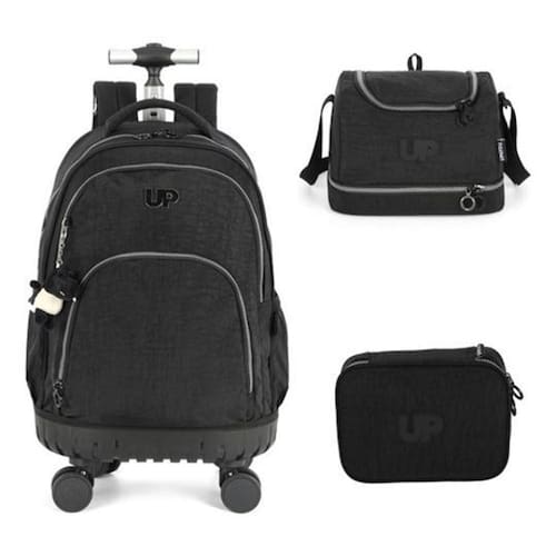Kit Escolar Mochila com Rodinhas Duplas giros 360º + Lancheira Térmica e Estojo 100 Pens, marca Up4you, com Porta Notebook. A mochila é feita Crinkle e tem design exclusivo e diferenciado da marca Up4you. O carrinho é feito em alumínio e as quatro rodinhas possuem giro 360, proporcionado leveza e facilidade ao transporte. O puxador é em forma de T, com botão para regular a altura. Ela também pode ser Utilizado nas costas pois possui alças ajustáveis e macias que se adaptam ao corpo. Vem com alça de mão fixa. Além de Contar com a novidade desse ano, o borrachão na parte da base que proporciona mais durabilidade e proteção do produto. A mochila é bastante espaçosa, perfeita para acomodar livros, ficheiros, cadernos e agenda. Na parte interna são duas divisões, com um compartimento para notebook. Os 3 compartimentos são fechados por zíper. - Carrinho em alumínio com puxador e rodinhas; - Logo em Metal Resinado UP - Alça de costas acolchoada; - Alça de mão reforçada; - Zíper Trator - Mochila super leve e resistente; - Acompanha Chaveiro Dinossauro Up4you. - Rodinhas Duplas Giros 360 - Medidas: 46x34x22 cm  AxLxP  Estojo em Crinkle super resistente e espaçoso, com capacidade máxima de 100 lápis. Ele possui dois compartimentos separados por uma divisória e vem com 20 elásticos, 10 de cada lado, para prender lápis e canetas em separado. Ideal para crianças e adolescentes levarem à escola e manterem os materiais separados e em ordem. Medida: 6x15x21  cm   AxLxC  Bolsa Lancheira Térmica em Crinkle, super-resistente, com 2 compartimentos, da marca Up4you. A lancheira é bastante espaçosa, perfeita para colocar potes com refeições e sanduíches, garrafas de água ou suco e frutas. Ideal para crianças e adolescentes levarem à escola ou adultos levarem para o trabalho, academia ou passeios ao ar livre. A lancheira contém uma alça regulável, que pode ser ajustada ou retirada quando necessário. Possui fechamento em zíper tratorado e elástico na parte de trás, para acoplar em mochilas de carrinho. - Lancheira térmica super leve e resistente. - Alça regulável, com opção de retirada. - Fechamento em zíper. - Medidas: 26x17x20 cm  AxCxL  - Não acompanha potinho e garrafa. de 6 meses contra defeito de fabricação Dicas e Cuidados; Proteja os objetos pontiagudos ou cortantes evitando o contato direto com o produto. Guarde o produto e um local seco, fresco e arejado, para evitar a proliferação de fungos que podem danificar o produto. Para Limpeza, use apenas água morna e sabão neutro nas partes metálicas somente uma flanela seca. Nunca aplique produtos abrasivos, solventes ou quaisquer agentes químicos. Para secagem, Utilize apenas pano seco. Não exponha ao sol e altas temperaturas por um período de tempo prolongado. Apare sempre os fios soltos do tecido, para que eles não se prendam no zíper. Duvida Faça-nos uma pergunta :