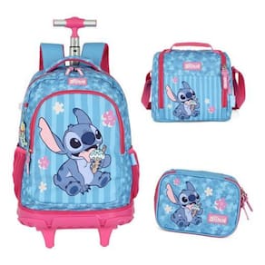 - amplo compartimento principal para melhor organização dos cadernos, livros e apostilas; - 1 compartimentos frontais com fechamento em zíper, para pequenos objetos; - dispõe de alça de mão e alça retrátil reforçada para uma melhor locomoção; - alças acolchoadas e reguláveis caso queira transportar no ombro; - rodinhas de silicone; - puxadores dos zíperes em borracha personalizados; - logo stitch emborrachado; - material: 100% poliéster e forro 100% poliéster. Acompanha penduricalho exclusivo stitch.