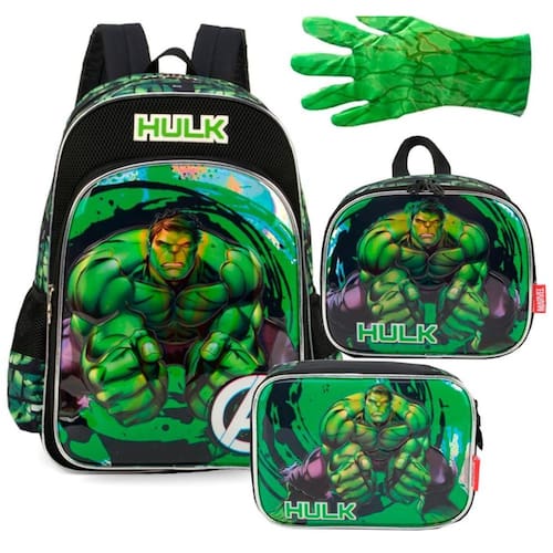 Contém: 01 un - mochila hulk avengers - ref.: is38101ag. 01 un - lancheira escolar infantil hulk avengers. 01 un - estojo box escolar infantil hulk avengers 01 un - luva imitando a mão do hulk.