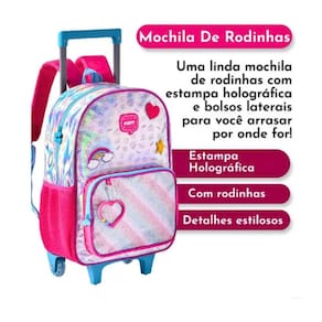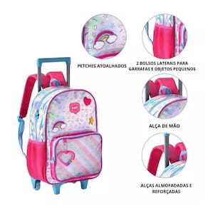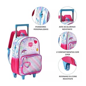 Marca: Clio Style; Rodas retráteis; Zíperes personalizados; Lancheira térmica; Alças reguláveis; Leve e fácil de transportar.