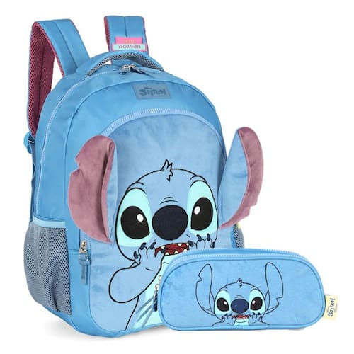 O Kit Mais Fofo da Ohana! Kit Mochila de Costas G + Estojo Triplo do Stitch AZUL de Pelúcia: Máximo Conforto e Organização! Para os fãs do Stitch que preferem a praticidade das mochilas de costas, este kit é a união perfeita de conforto e estilo! A mochila e o estojo apresentam o rosto do Stitch em uma pelúcia aveludada com orelhas em 3D, garantindo um visual super charmoso e único.