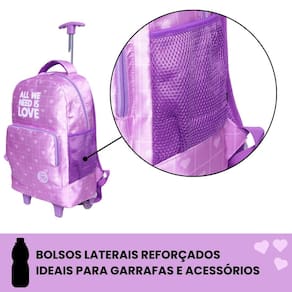 Kit Mochila de Rodinha Bolsa Estojo e Lancheira Coração Este lindo kit de mochila de rodinhas infantil feminina é perfeito para acompanhar as pequenas em todas as aventuras escolares e do dia a dia. Com um design encantador cheio de corações, este conjunto une praticidade, conforto e estilo. Características da Mochila: Versatilidade: Conta com rodinhas resistentes para facilitar o transporte e alças de costas acolchoadas e ajustáveis para maior conforto. Funcionalidade: Possui uma alça de mão prática e um compartimento principal espaçoso com uma divisão interna para manter tudo organizado. Bolsos Práticos: Um bolso externo com zíper para acesso rápido a itens essenciais e bolsos laterais perfeitos para garrafinhas ou pequenos objetos. Detalhes Encantadores: Os puxadores de zíper em formato de coração combinam perfeitamente com a estampa cheia de coraçõezinhos, tornando o kit ainda mais fofo. Dimensões: 42 cm de altura x 30 cm de largura x 18 cm de profundidade. Capacidade: 25 litros. Lancheira: Mantém os lanchinhos sempre organizados e acessíveis. Dimensões: 23 cm de altura x 17 cm de largura x 15 cm de profundidade. Estojo: Ideal para guardar lápis, canetas e outros materiais escolares. Dimensões: 23,5 cm de altura x 16 cm de largura x 6,8 cm de profundidade. Cuidados com o Produto: Evite carregar excesso de peso para preservar a estrutura da mochila. Não insira objetos pontiagudos ou cortantes para evitar danos ao material. Para limpeza, utilize apenas um pano úmido com sabão neutro; não use abrasivos ou solventes químicos. Com este kit incrível, as crianças vão adorar organizar seus materiais com estilo e praticidade. Um presente perfeito para acompanhar o dia a dia com conforto e diversão Marca: Não Informado