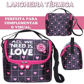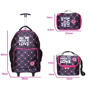 Kit Mochila de Rodinha Bolsa Estojo e Lancheira Coração Este lindo kit de mochila de rodinhas infantil feminina é perfeito para acompanhar as pequenas em todas as aventuras escolares e do dia a dia. Com um design encantador cheio de corações, este conjunto une praticidade, conforto e estilo. Características da Mochila: Versatilidade: Conta com rodinhas resistentes para facilitar o transporte e alças de costas acolchoadas e ajustáveis para maior conforto. Funcionalidade: Possui uma alça de mão prática e um compartimento principal espaçoso com uma divisão interna para manter tudo organizado. Bolsos Práticos: Um bolso externo com zíper para acesso rápido a itens essenciais e bolsos laterais perfeitos para garrafinhas ou pequenos objetos. Detalhes Encantadores: Os puxadores de zíper em formato de coração combinam perfeitamente com a estampa cheia de coraçõezinhos, tornando o kit ainda mais fofo. Dimensões: 42 cm de altura x 30 cm de largura x 18 cm de profundidade. Capacidade: 25 litros. Lancheira: Mantém os lanchinhos sempre organizados e acessíveis. Dimensões: 23 cm de altura x 17 cm de largura x 15 cm de profundidade. Estojo: Ideal para guardar lápis, canetas e outros materiais escolares. Dimensões: 23,5 cm de altura x 16 cm de largura x 6,8 cm de profundidade. Cuidados com o Produto: Evite carregar excesso de peso para preservar a estrutura da mochila. Não insira objetos pontiagudos ou cortantes para evitar danos ao material. Para limpeza, utilize apenas um pano úmido com sabão neutro; não use abrasivos ou solventes químicos. Com este kit incrível, as crianças vão adorar organizar seus materiais com estilo e praticidade. Um presente perfeito para acompanhar o dia a dia com conforto e diversão Marca: Não Informado Ean: 9252903209993