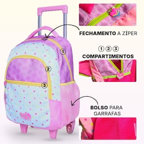 O Kit Mochila de Rodinha Bolinhas é a combinação perfeita de estilo e funcionalidade para o dia a dia escolar. A mochila, fabricada em poliéster resistente, possui três compartimentos espaçosos que garantem a organização de livros, cadernos e outros materiais. As rodinhas em gel e a alça retrátil em alumínio proporcionam um transporte leve e sem esforço, protegendo a coluna das crianças. Além disso, a mochila conta com bolsos laterais ideais para garrafinhas de água. Acompanha uma lancheira térmica para manter os lanches frescos e um estojo para canetas e lápis, ambos seguindo o mesmo design encantador de bolinhas.