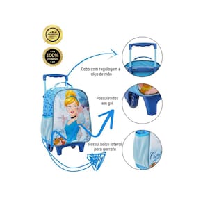 Design da Cinderela com brilho: Todos os itens possuem um design exclusivo com a personagem favorita das crianças e detalhes brilhantes que encantam. Mochila de rodinha: Facilita o transporte dos materiais escolares e proporciona mais conforto para a criança. Lancheira: Ideal para guardar lanches e bebidas. Estojo simples: Espaço suficiente para organizar lápis, canetas e outros materiais. Zíper resistente: Garante maior durabilidade e segurança em todos os itens. Bolsos laterais: Ideais para guardar garrafinhas ou outros objetos pequenos. Alça de mão e de costas: Versatilidade para carregar a lancheira da forma mais confortável. Detalhes personalizados: Tornam o kit ainda mais especial e único. Alças acolchoadas e reguláveis: Adaptam-se perfeitamente às costas da criança.