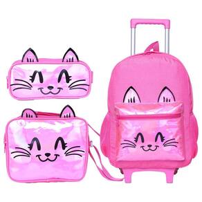 Kit Mochila De Rodinha Menina Estojo Lancheira Gatinho- Rosa