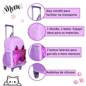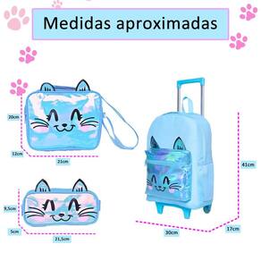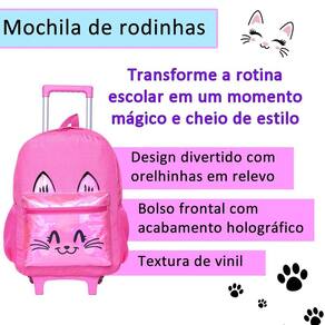 Este kit de mochila de rodinhas feminina é a combinação perfeita de encanto, praticidade e estilo Com um design encantador em rosa com glitter sutil, estampa fofa de gatinho e detalhes holográficos no bolso externo, ele é ideal para meninas que amam brilhar e se destacar. Características da Mochila: Design Encantador: Rosa com glitter suave e estampa de um adorável gatinho que conquista corações. O bolso externo com detalhes holográficos dá um toque moderno e mágico. Praticidade e Conforto: Rodinhas resistentes para facilitar o transporte. Alça de mão funcional para maior versatilidade. Dois bolsos laterais perfeitos para garrafas ou itens de fácil acesso. Organização Essencial: Compartimento principal amplo para guardar materiais escolares. Bolso externo com zíper para itens menores. Dimensões: 41 cm de altura x 30 cm de largura x 17 cm de profundidade. Características da Lancheira: Isolamento Térmico: Mantém os lanches frescos e prontos para o consumo. Praticidade em Tamanho Compacto: Uma divisão espaçosa para alimentos e bebidas. Dimensões: 22 cm de comprimento x 6,5 cm de altura. Características do Estojo: Compacto e Prático: Divisão única perfeita para armazenar lápis, canetas e pequenos acessórios escolares. Dimensões: 23,5 cm de comprimento x 7 cm de altura. Por que escolher este kit Estilo Encantador: O glitter, o gatinho e os detalhes holográficos tornam este kit um acessório único e adorável para qualquer ocasião. Funcionalidade e Conforto: Com espaço suficiente e design prático, ele é perfeito para manter tudo organizado. Durabilidade Garantida: Feito com materiais de alta qualidade, é ideal para acompanhar as crianças em sua rotina diária. Leve brilho e fofura para o dia a dia escolar Este kit é perfeito para meninas que desejam unir estilo, praticidade e um toque mágico em cada detalhe. Marca: Não Informado