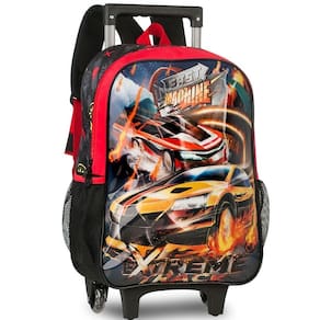 MOCHILA - A mochila de rodinhas é confeccionada em poliéster 420D com frente em PVC prensado em baixo relevo e puxador de metal personalizado. - Detalhe frontal em verniz com estampa de carros. O tecido lateral e das costas é com estampa personalizada. - Possui bolso principal com zíper, bolsos laterais telados, alça de mão e alças de costas acolchoadas e reguláveis. - Carrinho embutido com rodinhas de silicone e apoio frontal. - Tamanho aproximado: 47 x 32 x 17cm