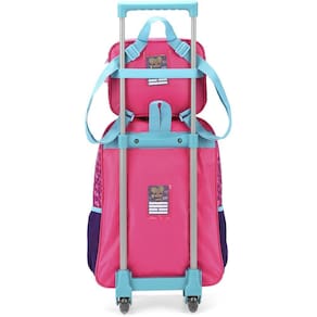 Kit mochila de rodinhas com bolsos laterias em tela com elástico, alças de costas espumadas e reguláveis, silk frontal, bolso frontal com zíper, alça de mão. Lancheira estampada com alça de costas e alça de mão, além de etiquetas personalizadas.