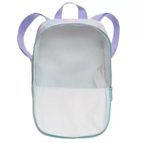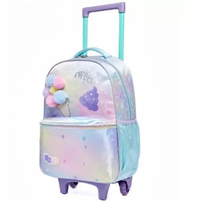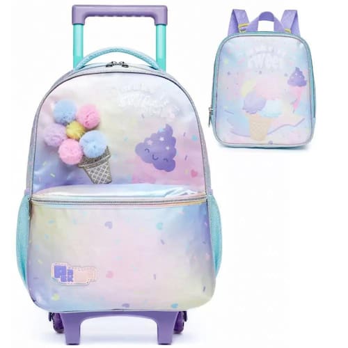 Coleção confeccionada em cetim com estampa corrida. Painel frontal com impressão em transfer com aplicação de glitter localizado. Sorvete 3D feito de pompons de tule. Patch de PU com glitter com bordado. Impressão em transfer e patch PVC no bolso frontal. Puxador de zíper em metal com logo em baixo relevo. Etiqueta de identificação em silk impressa no painel traseiro. Conta também com uma lancheira toda personalizada da personagem, além de etiquetas personalizadas.