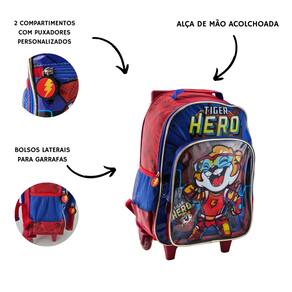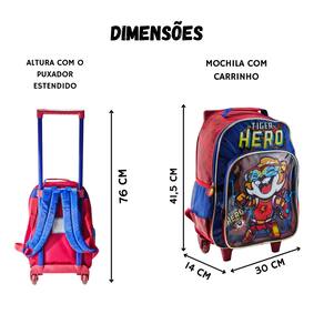 Mochila infantil com rodas de qualidade, ótimo espaço interno, com 2 divisórias e 2 bolsos laterais, com cursores dos zíperes personalizados, alças de ombros acolchoados e ajustáveis, 1 etiqueta de identificação da criança e alça de mão acolchoada.