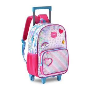 A Mochila de Rodinhas Holográfico Happy com Lancheira e Estojo é um conjunto perfeito para crianças e adolescentes que buscam estilo e praticidade para o dia a dia escolar ou passeios. A mochila possui um design moderno e atraente com acabamento holográfico, que reflete cores vibrantes e sonoras, chamando atenção de forma lúdica e divertida.
