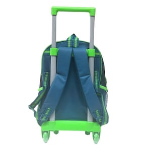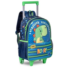 MOCHILA A mochila de rodinhas é confeccionada em poliéster 420D com frente em PVC prensado em baixo relevo e puxador de metal personalizado. Detalhe frontal em verniz com estampa de dinossauros e etiquetas de borracha. O tecido lateral e das costas é com estampa personalizada. Possui bolso principal com zíper, bolsos laterais telados, alça de mão e alças de costas acolchoadas e reguláveis. Carrinho embutido com rodinhas de silicone e apoio frontal. Tamanho aproximado sem considerar as hastes e rodinhas: 39 x 38 x 12cm