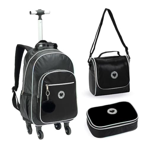 Kit Mochila de Rodinhas + Lancheira + Estojo Just Love DENLEX Preta -