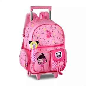 O kit de mochila de rodinhas oficial da luluca é confeccionado em material soft com patch do pandalu com glitter. Mochilas com chaveiro e com bolso transparente para trocar a estampa da roupa da luluca.
