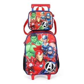 Kit mochila de rodinhas com bolsos laterias em tela com elástico, alças de costas espumadas e reguláveis, silk frontal, bolso frontal com zíper, alça de mão. Lancheira estampada com alça de costas e alça de mão, além de etiquetas personalizadas.