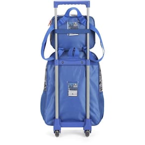 Kit mochila de rodinhas com bolsos laterias em tela com elástico, alças de costas espumadas e reguláveis, silk frontal, bolso frontal com zíper, alça de mão. Lancheira estampada com alça de costas e alça de mão, além de etiquetas personalizadas.