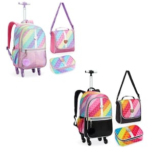 Mochila de Rodinhas: Amplo compartimento principal, ideal para transportar livros, cadernos e outros materiais escolares. Rodinhas e alça retrátil para fácil transporte.