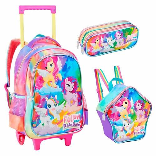 - 1 Mochila de Rodinhas Unicórnio Arco-Íris Rainbow DENLEX 1 Estojo Duplo Unicórnio Arco-Íris Rainbow DENLEX 1 Lancheira Térmica Unicórnio Arco-Íris Rainbow DENLEX