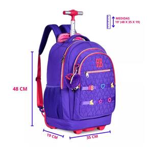 Mochila de rodinhas: Possui um design moderno com detalhes exclusivos da personagem Rebecca Bonbon, a adorável bulldog francesa, estampada em cores vibrantes. As rodinhas facilitam o transporte, evitando o peso nas costas, e a alça retrátil ajustável é ergonômica, oferecendo conforto. A mochila conta com um amplo espaço interno para cadernos, livros e materiais escolares, além de bolsos laterais para garrafinhas e pequenos objetos.