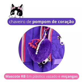 Lancheira térmica: Ideal para manter os alimentos frescos por mais tempo. Também estampada com o tema Rebecca Bonbon, ela possui revestimento térmico, fechamento em zíper e alça de mão para facilitar o transporte. Além disso, pode ser acoplada à mochila, tornando o kit ainda mais prático.