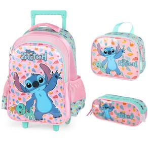 Características: Marca: Luxcel Linha: Disney Stitch Cor: ROSA Material: 100% poliéster e PVC Cód.: IC41552SCKT Conteúdo do kit: 1 mochila de rodinhas, 1 lancheira e 1 estojo triplo