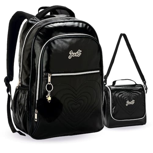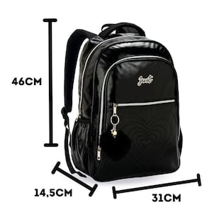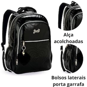 Mochila -Medidas:46cm x 30cm x 14,5cm -Puxadores Personalizados -Três Divisórias -Bolsos Laterais Porta Garrafa -Bordado Exclusivo De Coração -Material Brilhante -Chaveiro Exclusivo -100% Poliéster