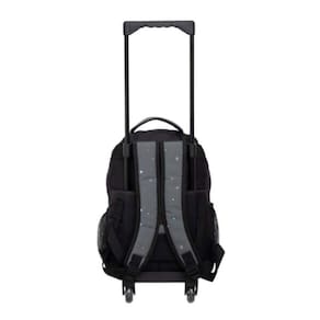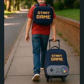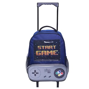 1 Bolso Principal, 1 frontal e 2 Laterais para garrafinhas; Mochila de carrinho com com alças de costas; Zíper com puxador personalizado em formato de controle de vídeo-game;