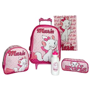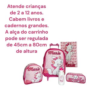 Características mochila: Material: 70% poliéster e 30% pvc 2 compartimentos com 2 zíperes Compartimento nas laterais para garrafas Alças reforçadas Alça superior de mão Puxadores personalizados Bolsos laterais porta cantil Alças ajustáveis Rodas de silicone e apoio frontal Carrinho embutido