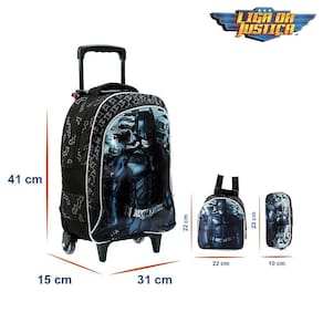 Kit Mochila Escolar Infantil DC Batman Liga da Justiça Com Rodinhas, acompanha lancheira e estojo. Agora você pode levar sua mochila do Batman no seu dia a dia ou acompanhar você na escola. Possui alça de mão reforçada. Sua abertura maior se dá por zíper com puxador. Na parte de dentro possui amplo espaço para a guardar diversos materiais como cadernos, livros e estojos. Na parte da frente, possui bolso com zíper para a guardar pertences de menor tamanho, e bolsos laterais. Características: Especificações: - Alça superior - Estampa no bolso frontal - Puxador retrátil- Zíper metálico- Bolso Lateral Medidas Lancheira: - Altura: 22cm- Largura: 22cm Medidas Estojo: - Altura: 10cm- Largura: 23cm Medidas Mochila: - Altura: 41cm- Largura: 15cm- Comprimento: 31cm Dúvidas Frequentes:1. A mochila possui rodinhas em siliconeR. Sim, ela possui rodinhas em silicone transparente. 2. Ela possui alça retrátilR. Sim, ela possui alça retrátil para ocupar menos espaço. 3. Ela possui quantas divisõesR. Ela possui 02 divisões para guardar suas coisas. 4. Qual o material da mochilaR. Ela é feita em poliéster e plástico. Tags:Mochila, escola, escolar, meninas, meninos, infantil, rodinha, material, personagem, batman, dc, herói, liga da justiça, batcaverna, batmovel, ghotam. Marca: Toys 2U