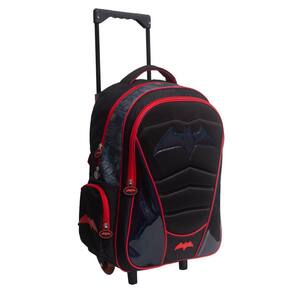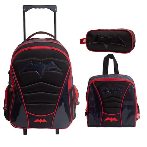 Mochila Infantil de Rodinhas: Este acessório é mais do que uma mochila comum. Inspirado no icônico herói morcego, apresenta uma frente em PVC holográfico que a torna única e deslumbrante. Com bolsos espaçosos, garantem um espaço amplo e organizado para livros, cadernos e materiais escolares essenciais.