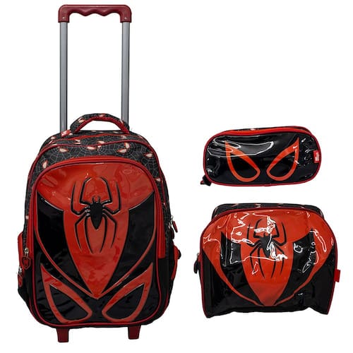 Prepare-se para equipar os pequenos heróis com o kit perfeito para as aventuras escolares com a Mochila de Rodinhas, Lancheira Térmica e Estojo da linha Spider da Yins YS42239!