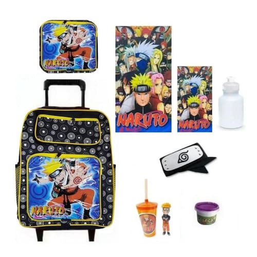 Kit Mochila Escolar Naruto Lancheira Bandana com 8 Itens Mochila infantil de 1º linha de alta resistência. O melhor preço do mercado. Este kit Contém: 1- Mochila do Naruto com Rodinha G 2- Lancheira com alça 3- Squeeze 4- Copinho + Boneco do Naruto 5- Bandana de Konoha 6- Slime 7- Toalha de Banho 8- Toalha de Mão Características mochila: Material: Nylon 600 1 compartimento com 2 Bolsos frontais Compartimento nas laterais para garrafas Alças reforçadas; Alça superior de mão; Bolsos laterais porta cantil; Alças ajustáveis; Rodas de silicone e apoio frontal; Carrinho embutido;