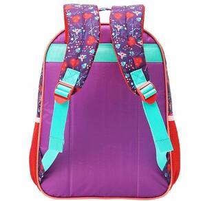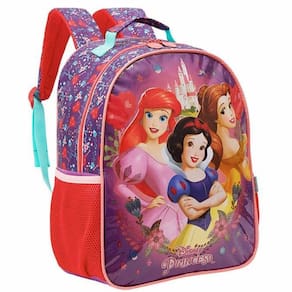 A mochila das Princesas é feita de poliéster resistente, com frente em PVC + glitter localizado e puxador do zíper de metal personalizado. Possui um compartimento amplo, alças ajustáveis e acolchoadas, garantindo conforto e adaptabi