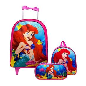 Kit mochila feminina infantil rodinhas pequena sereia lancheira e estojo Mochila de rodinhas infantil feminina pequena sereia com lancheira térmica e estojo combinando na mesma estampa ideal para escola ou viagem. Mochila exclusiva para quem procura qualidade, estilo, modernidade e praticidade. Possui um ótimo espaço já que contém dois compartimentos com zíper e dois bolsos externos laterais. Suficiente para carregar livros, cadernos, agenda e estojo. Vem junto lancheira térmica que encaixa no carrinho de mão e conserva temperatura de alimentos e bebidas. Ideal para uso escolar ou viagem. Estampa atual, versátil e indispensável no dia-a-dia.
