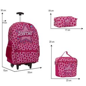 Kit Mochila Escolar Infantil Barbie Rodinhas, acompanha lancheira e estojo. Possui alça de mão reforçada. Agora você pode levar sua mochila no seu dia a dia ou acompanhar você na escola. Sua abertura maior se dá por zíper com puxador. Na parte de dentro possui amplo espaço para a guardar diversos materiais como cadernos, livros e estojos. Na parte da frente, possui bolso com zíper para a guardar pertences de menor tamanho e bolsos laterais.