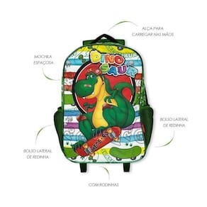 Kit Mochila Infantil Escolar com 03 Peças Dinossauro Verde Kit Mochila Infantil Escolar com 03 Peças Dinossauro Verde ===================================== Vem com uma mochila de rodinhas com compartimento principal espaçoso ideal para acomodar os livros, cadernos e materiais escolares no geral e mais dois bolsos laterais de redinha para garrafas.